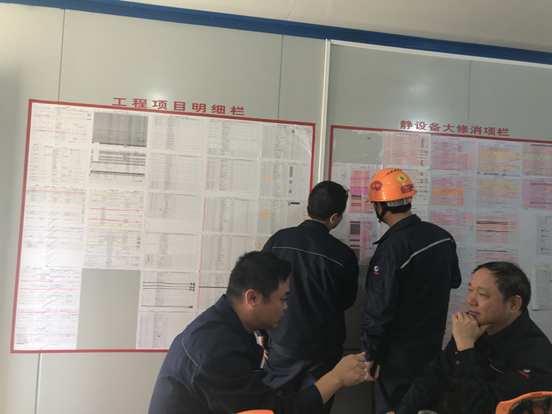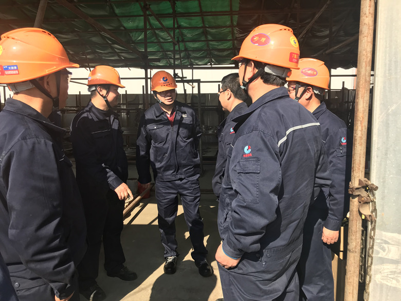 劉董事長一行從2#大門進入裝置,映入眼簾的是一支支辛勤勞動、細致嚴謹的檢修隊伍。每當經過我公司將士檢修的裝置時,副指揮王建明就會一一介紹該區域總體的檢修內容、參檢專業、當前進度和關鍵重點項目及困難點。對于現場標準化的作業和嚴格的安全管理,劉董事長頻頻點頭,并表示,檢修進入關鍵時期,切記要強化管理,全局督查,全力以赴搞好此次檢修工作,確保安全、質量、進度全面受控。